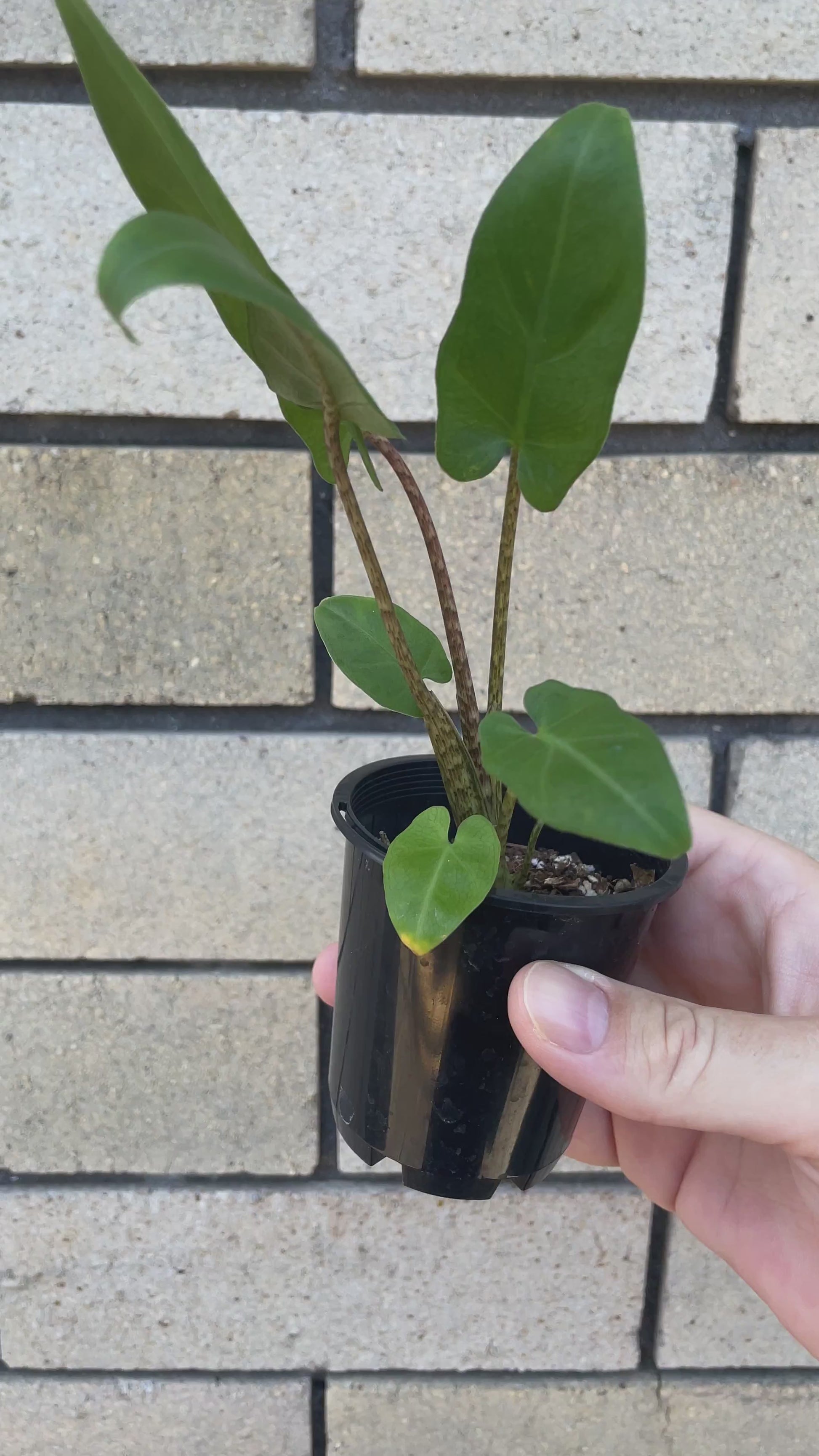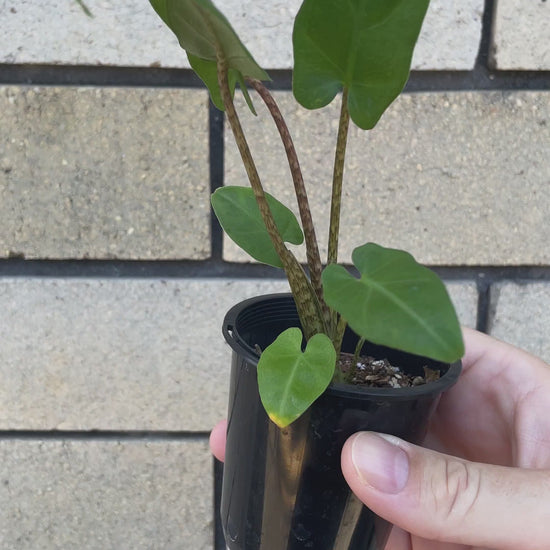 Alocasia lauterbachiana, often called the Purple Sword, is a striking plant with long, narrow leaves that taper into elegant points. The deep green foliage has a subtle wave along the edges and is beautifully contrasted by rich purple undersides.